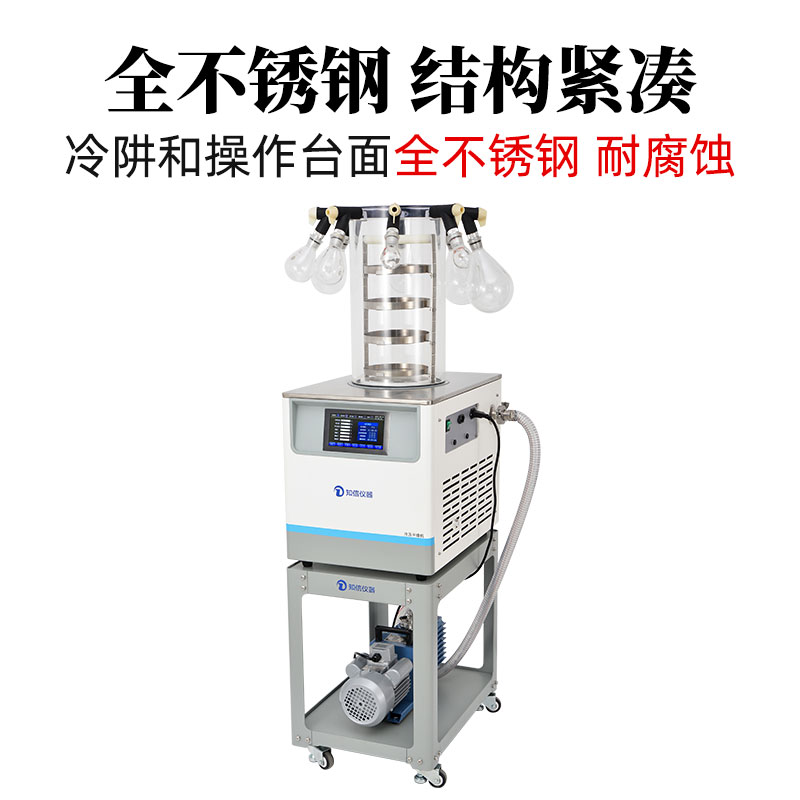 冷凍干燥機是將含水物品預(yù)先凍結(jié),然后使其水分在真空狀態(tài)下升華而獲得干燥物品的一種技術(shù)方法。經(jīng)冷凍干燥后物品理化性質(zhì)、生物特性基本不變,易于長期保存,復(fù)水后物品能迅速恢復(fù)到凍干前的形態(tài),并且能保持其原有的生化特性。因此,冷凍干燥機在化工、食品、醫(yī)藥、生物等制品的制備和檢測領(lǐng)域得到廣泛應(yīng)用。