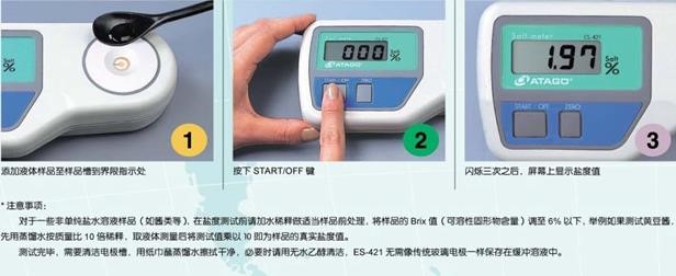 添加液體樣品至樣品槽界限指示處→按下START/OFF鍵→閃爍三次之后,屏幕上顯示鹽度值。
