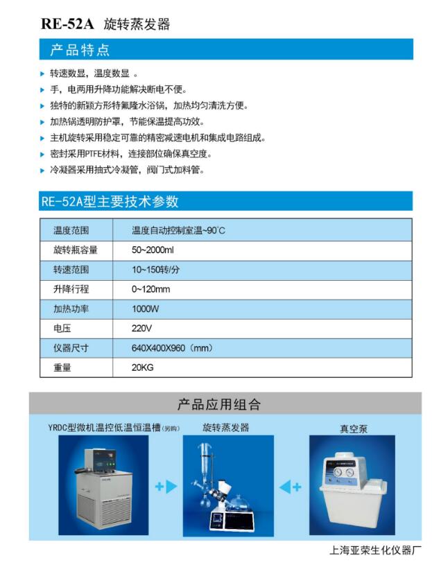 用途簡介:旋轉式蒸發(fā)器是采用旋轉蒸發(fā)瓶(燒瓶),增大蒸發(fā)面積在減壓下置于水浴中一邊旋轉,一邊加熱的裝置,使瓶內溶液擴散蒸發(fā)。是化學工業(yè),醫(yī)藥工業(yè),高等院校和科研實驗室等單位用于制造及分析實驗賴以濃縮,干燥,回收等較為理想的必備基本儀器。