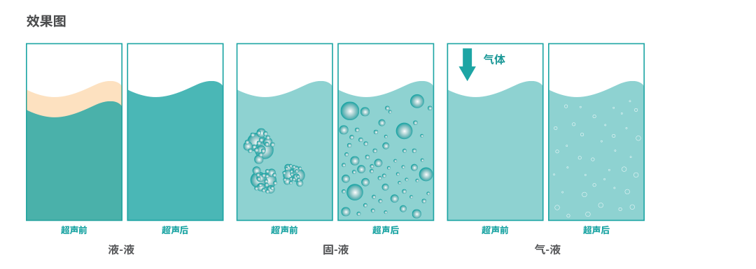 超聲波發生器和超聲波換能器組件兩大部分組成。超聲波發生器(電源)是將220VAC、50Hz的單相電通過變頻器件變為20-25kHz、約600V的交變電能、并以適當的阻抗與功率匹配來推動換能器,作縱向機械振動,振動波通過浸入在樣品溶液中的鈦合金變幅桿對被分散的各種樣品產生空化效應,從而達到超聲分散的目的。