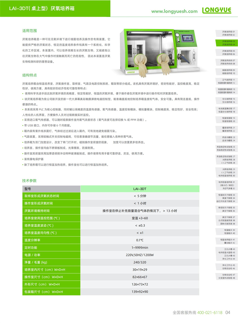 厭氧培養箱是一種可在無氧環境下進行細菌培養及操作的專用裝置,它能提供嚴格的厭氧狀態、恒定的溫度培養條件和具有一個系統化、科學化的工作區域,本裝置內,可以培養很難生長的厭氧生物,又能避免以往厭氧生物在大氣中操作時接觸氧而死亡的危險性, 因此本裝置是厭氧生物檢測科研的理想設備。