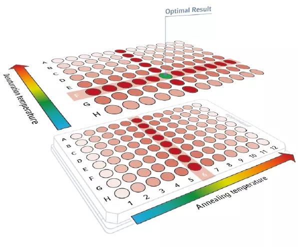 早期的PCR條件優化只能一次又一次地不停嘗試各種實驗條件的組合,直到90年代中期Eppendorf在5331系列PCR上實現了不同列之間不同溫度的功能,一次實驗就能夠測試12個不同的條件,一下子將PCR實驗條件優化的效率提高了10倍以上,這也是我們所熟知的PCR梯度功能。