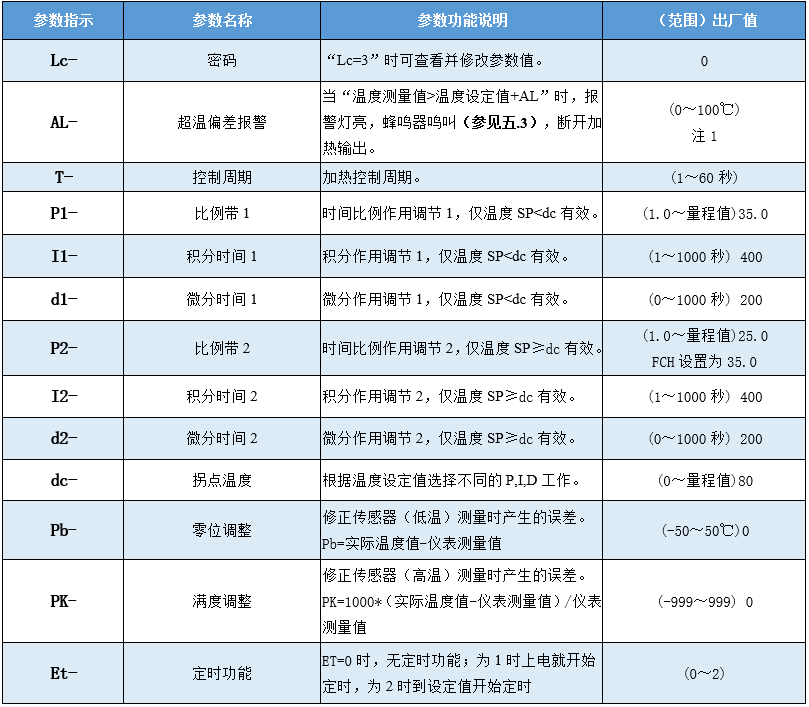 再點擊設定鍵,若密碼值不正確,控制器自動返回到正常顯示狀態,若密碼值正確,則進入到溫度內部參數設定狀態,再點擊設定鍵可以依次修改各個參數。