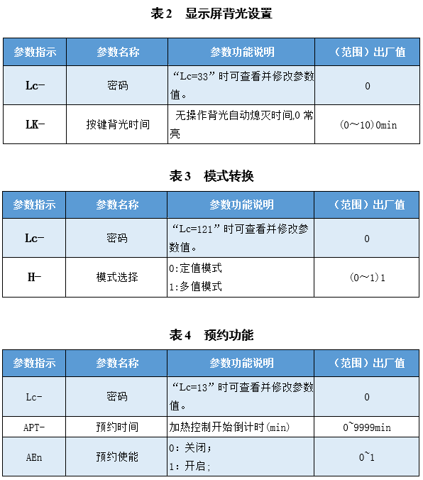 長按“設定”鍵,輸入密碼“13”,顯示“APT-”后設定預約時間,再點擊“設定”鍵,顯示預約開關“AEn”,輸入“0”表示關閉預約,輸入“1”表示開啟預約,再次點擊“設定”鍵退出后自動進入預約倒計時,時間到后進入溫度控制。